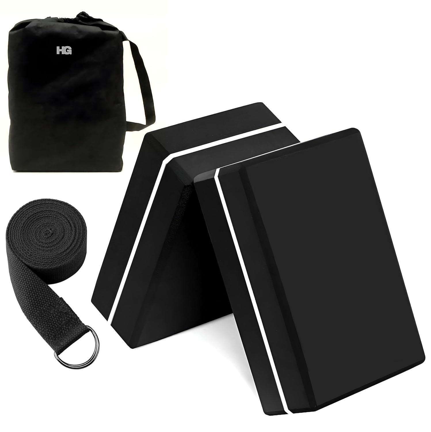 Set of 2 lightweight, non-slip yoga blocks with strap. Helps improve flexibility and balance during yoga or pilates sessions.